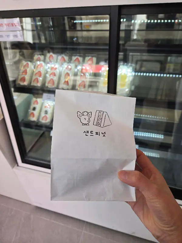 무엇을 먹을까 고민하다가, 가장 인기 있다는 딸기 산도와 두바이 쫀떡 쿠키, 그리고 키위 산도를 골랐다. 샌드위치를 담아주는 종이 봉투에는 귀여운 돼지 캐릭터와 샌드위치 그림이 그려져 있었다. 작은 부분까지 신경 쓴 센스가 돋보였다. 왠지 모르게 선물 받는 기분까지 들었다.
