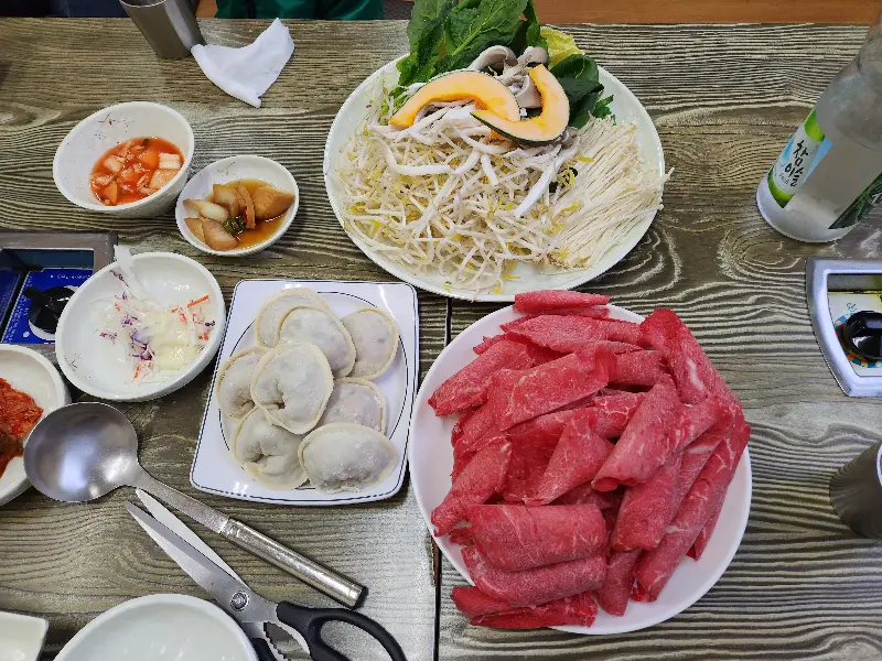 푸짐하게 차려진 만두와 샤브샤브 재료