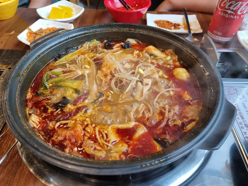 양꼬치를 먹다 보니, 다른 메뉴에 대한 궁금증이 생겼다. 특히 많은 사람들이 칭찬했던 마라탕의 맛이 궁금해졌다. 결국 마라탕을 추가로 주문했다. 커다란 그릇에 담겨 나온 마라탕은 보기만 해도 얼큰해 보이는 비주얼을 자랑했다. 국물을 한 입 떠먹으니, 매콤하면서도 깊은 맛이 온몸을 휘감는 듯했다.
