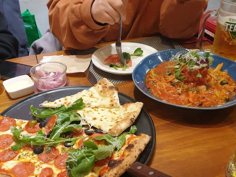 가게 문을 열고 들어서자, 아늑하고 편안한 분위기가 나를 감쌌다. 은은한 조명 아래 따뜻한 색감의 나무 테이블과 의자가 놓여 있었고, 벽면에는 아기자기한 소품들이 장식되어 있었다. 마치 친구 집에 놀러 온 듯한 편안함이 느껴졌다. 활기찬 분위기 속에서 요리사들이 분주하게 움직이는 모습이 보였다. 특히 눈길을 사로잡은 것은 커다란 화덕이었다. 활활 타오르는 불길을 바라보며 갓 구워져 나올 피자의 맛을 상상하니 저절로 입안에 침이 고였다.