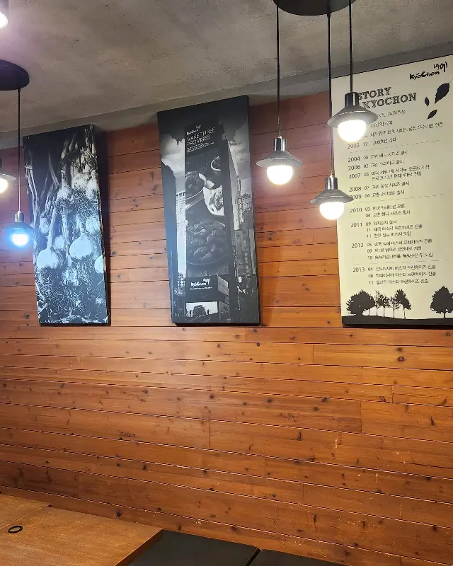 가게 문을 열자, 익숙한 듯 따뜻한 치킨 냄새가 코를 간지럽혔다. 노릇하게 튀겨진 닭 냄새는 언제나 나의 후각을 자극한다. 마치 오랜 친구를 만난 듯, 편안하고 친근한 기분이 들었다. 벽면에는 교촌치킨의 역사를 담은 사진과 이야기들이 걸려 있었다. 나무 질감으로 마감된 벽과 은은하게 빛나는 조명은 아늑한 분위기를 자아냈다. 잠시 기다리는 동안 벽에 걸린 사진들을 구경했다. 마치 시간 여행을 떠난 듯, 교촌치킨의 변천사를 한눈에 볼 수 있었다.