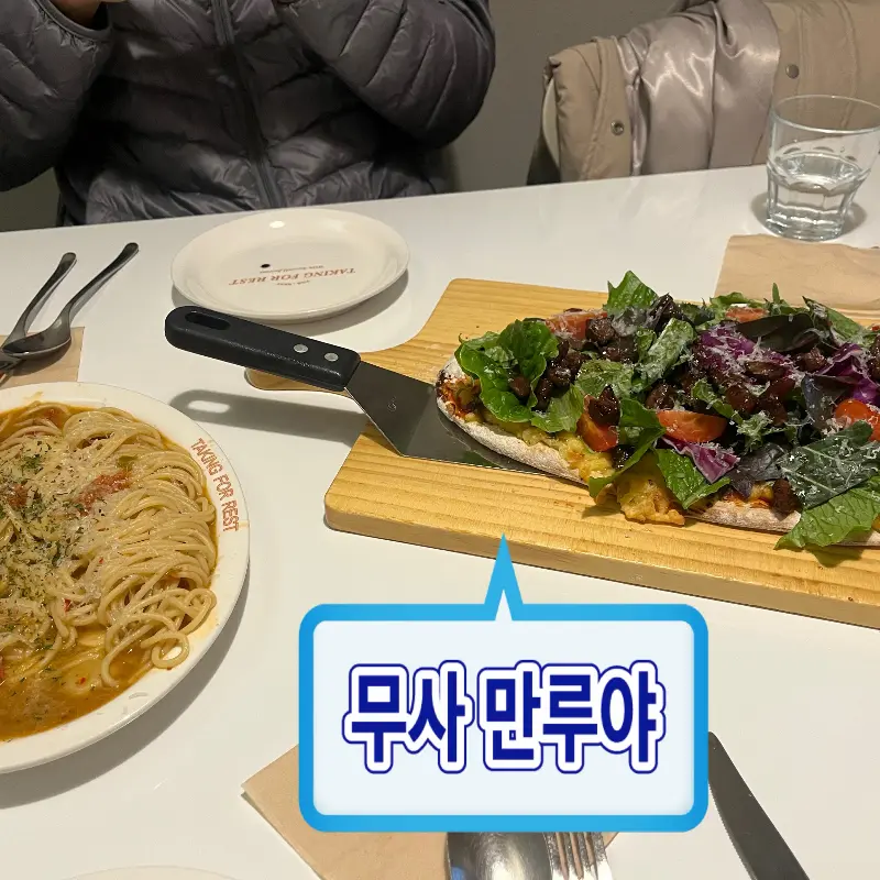피자를 한 입 베어 무니, 입안에서 다채로운 맛의 향연이 펼쳐졌다. 바삭한 도우와 상큼한 토마토소스, 신선한 채소의 아삭함, 그리고 부드러운 스테이크의 조화는 그야말로 환상적이었다. 특히 스테이크는 씹을수록 육즙이 흘러나와, 피자의 풍미를 더욱 깊게 만들어 주었다. 샐러드와 함께 먹는 피자라 그런지, 느끼함 없이 산뜻하게 즐길 수 있었다.