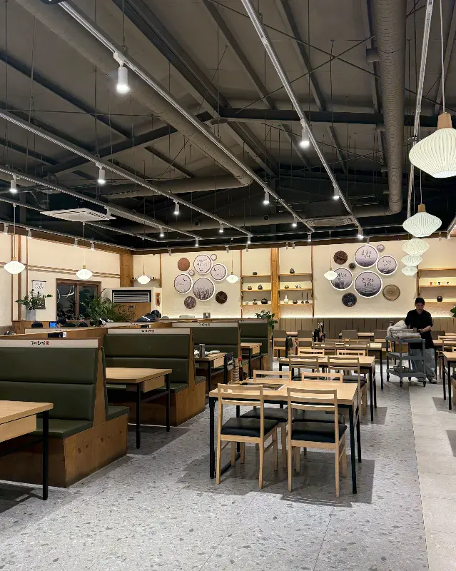 넓고 쾌적한 공간이 눈에 들어왔다. 테이블 간 간격도 넉넉해서 편안하게 식사를 즐길 수 있을 것 같았다. 인테리어는 전체적으로 우드톤으로 꾸며져 있었고, 은은한 조명이 따뜻한 분위기를 더했다. 마치 시골 할머니 댁에 온 듯한 포근함이 느껴졌다. 군데군데 놓인 아기자기한 소품들도 눈길을 끌었다. 벽에 걸린 쟁반 모양의 장식품들은 전통적인 느낌을 더해주었고, 곳곳에 놓인 화분들은 싱그러움을 선사했다. 에서 볼 수 있듯이, 깔끔하게 정돈된 내부 덕분에 식사 전부터 기분이 좋아졌다.