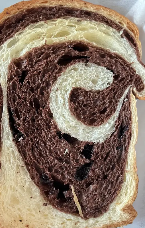 진열대에는 먹음직스러운 빵들이 저마다의 자태를 뽐내고 있었다. 윤기가 흐르는 식빵, 큼지막한 밤이 콕콕 박힌 밤식빵, 초콜릿 소용돌이가 매혹적인 초코식빵까지, 눈을 어디에 둬야 할지 모를 행복한 고민에 빠졌다. 특히 시선을 사로잡은 건 초코식빵이었다. 에서 보았던 섬세한 마블링이 실물로 더욱 황홀하게 다가왔다. 빵칼로 잘라낸 단면은 마치 예술 작품처럼 정교했고, 겹겹이 쌓인 초콜릿의 향긋한 풍미가 코끝을 간질였다.
