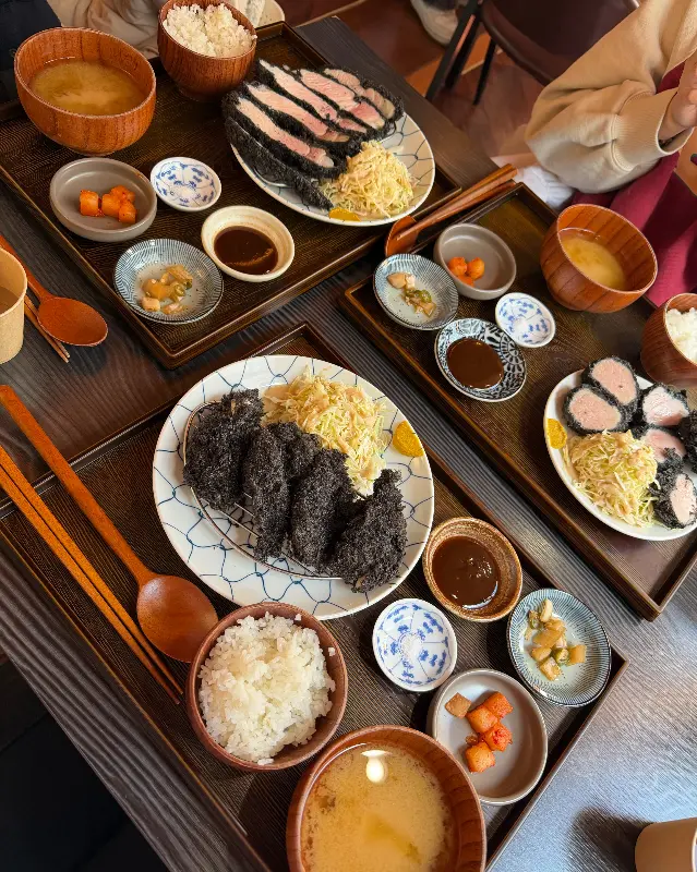 드디어 기다리던 모듬카츠가 나왔다. 가장 먼저 눈에 띈 것은 튀김옷의 색깔이었다. 일반적인 돈카츠와는 달리, 검은색 빵가루를 사용해서 튀겨낸 것이 독특했다. 튀김옷은 바삭했고, 속은 촉촉한 육즙으로 가득 차 있었다. 흑돼지 특유의 풍미도 훌륭했다. 등심은 쫄깃한 식감이 좋았고, 안심은 입에서 살살 녹는 듯한 부드러움이 일품이었다. 치즈카츠는 고소한 치즈와 돼지고기의 조화가 환상적이었다. 겉은 바삭하고 속은 촉촉한, 완벽한 튀김옷이 흑돼지의 풍미를 한층 더 끌어올리는 느낌이었다. 함께 제공된 소스에 찍어 먹으니, 돈카츠의 풍미가 더욱 깊어졌다. 특히, 레몬즙을 살짝 뿌려 먹으니 느끼함도 사라지고 상큼함이 더해져 더욱 맛있게 즐길 수 있었다.
