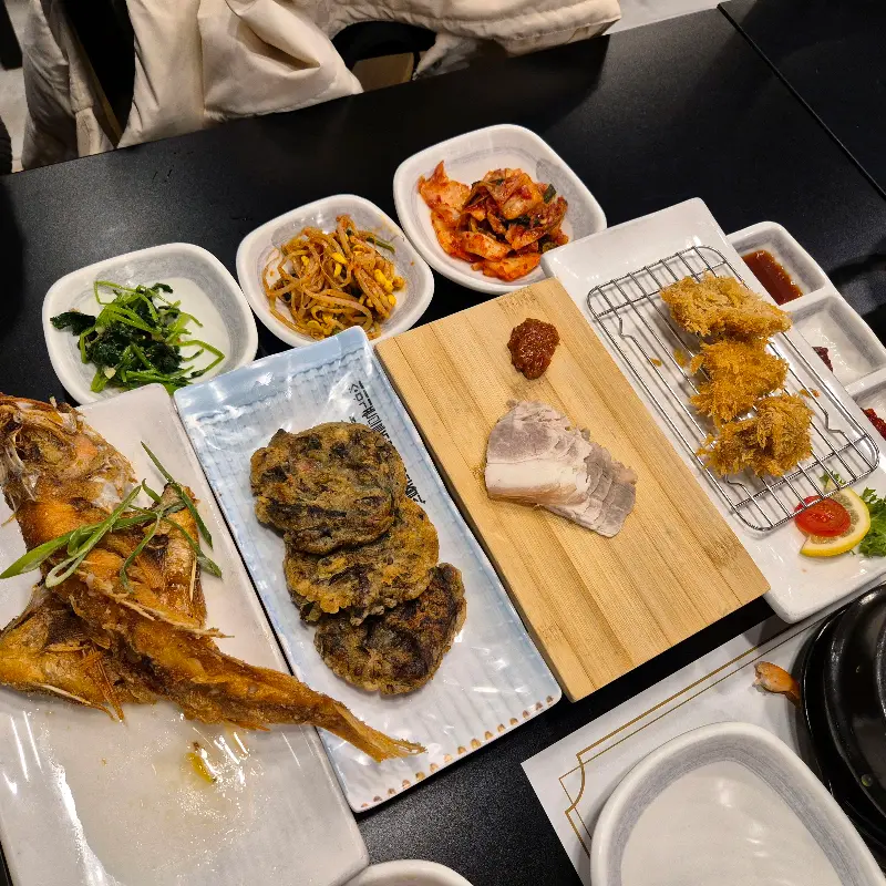 드디어 기다리고 기다리던 갈치구이 등장! 4인 테이블이 꽉 찰 정도로 엄청 큰 갈치가 눈앞에 놓이는데, 진짜 웅장하다는 느낌이 들 정도였어. 겉은 바삭하고 속은 촉촉한 갈치, 비린내는 하나도 안 나고 담백하면서 고소한 맛이 진짜 예술이야. 같이 나온 전복, 새우, 문어, 성게도 신선함이 그대로 느껴져서, 바다 향을 입안 가득 느낄 수 있었어. 특히 갈치구이는 직원분들이 직접 손질해주셔서, 먹기 편하게 가시를 발라주시는데, 서비스 최고! 덕분에 아이랑 같이 온 가족들도 편하게 식사할 수 있겠더라.