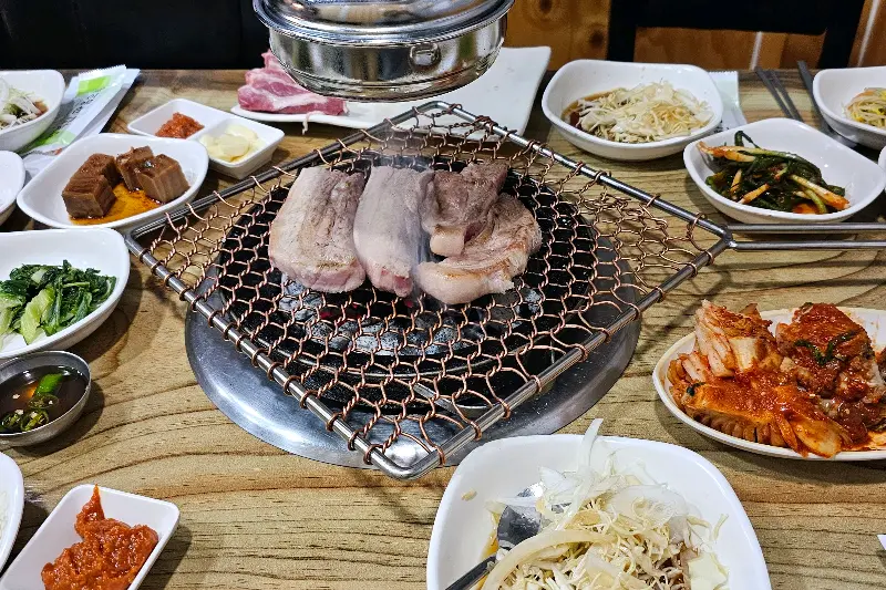 자리에 앉자마자 메뉴판 스캔! 역시 메인은 삼겹살이겠지? 고민할 필요도 없이 삼겹살을 주문했다. 다른 메뉴들도 눈에 들어왔지만, 오늘은 오로지 삼겹살에 집중하기로 했다. 밑반찬이 촤라락 깔리는데, 와… 반찬 종류도 엄청 다양하고 하나하나 다 정갈하다. 특히 쌈 채소가 완전 싱싱! 딱 봐도 좋은 재료를 쓴다는 게 느껴진다.