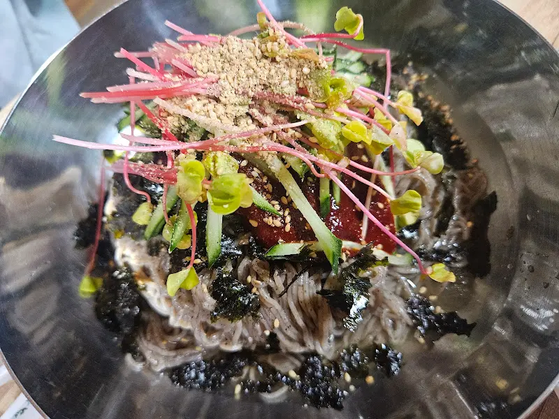 드디어 기다리고 기다리던 비빔막국수가 나왔다. 스텐 그릇에 담겨 나온 막국수는 보기만 해도 시원함이 느껴졌다. 가운데에는 돌돌 말린 메밀면이 자리 잡고 있었고, 그 위로 채 썬 오이와 빨간 양념장, 김가루, 깨가 듬뿍 뿌려져 있었다. 특히, 핑크와 퍼플을 오가는 색감의 새싹 채소가 고명으로 올려져 있어 눈길을 끌었다.