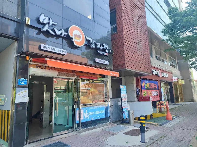 계룡역에서 그리 멀지 않은 곳에 위치한 맛나감자탕 본점은, 멀리서도 한눈에 띌 만큼 큼지막한 외관을 자랑했다. 홈플러스 계룡점 뒷편 길 건너편에 자리하고 있어 찾기도 쉬웠다. 건물 외벽에 커다랗게 적힌 상호와 그림이, 이곳이 바로 그 유명한 감자탕집임을 알려주는 듯했다. 에서 볼 수 있듯이, 깔끔하고 현대적인 건물 디자인은 맛에 대한 기대감을 한층 더 높였다. 주차장이 완벽하게 구비되어 있다고는 할 수 없지만, 주변 길가나 골목에 적당히 주차할 공간이 있어 크게 불편하지는 않았다.