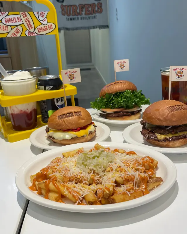 버거의 첫인상은 강렬했다. 빵 위에는 BURGER BAY라는 로고가 선명하게 새겨져 있었고, 꽂혀있는 작은 깃발에는 “BITE & JOY”라는 문구가 적혀 있었다. 빵을 살짝 들춰보니, 4가지 치즈가 용암처럼 흘러내리고 있었다. 체다, 모짜렐라, 고다, 그리고 또 다른 무언가가 섞여, 깊고 진한 향을 뿜어냈다. 그 아래에는 두툼한 패티와 신선한 야채들이 층층이 쌓여 있었다.