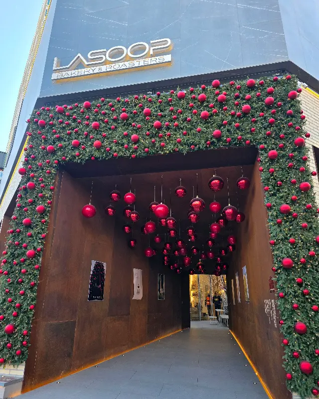 입구부터 심상치 않았다. 붉은색 방울 장식과 푸른 잎사귀로 뒤덮인 터널을 지나 안으로 들어서자, 넓은 매장이 눈 앞에 펼쳐졌다. 1층에는 맛있는 빵들이 가득한 진열대와 주문대가 있었고, 안쪽에는 2층으로 향하는 계단이 자리하고 있었다.