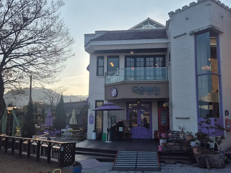 드디어 목월빵집 앞에 도착했다. 보라색 포인트 컬러가 인상적인 외관이 눈에 띄었다. 아담한 2층 건물은 마치 동화 속에 나오는 빵집 같았다. 건물 옆으로는 작은 실개천이 흐르고, 야외 테이블이 놓여 있어 정겨운 분위기를 더했다. 가게 앞으로는 꽤나 널찍한 공간이 펼쳐져 있어 답답함 없이 탁 트인 느낌을 준다. 맑은 하늘 아래, 나뭇가지 사이로 쏟아지는 햇살이 따스하게 나를 감쌌다.