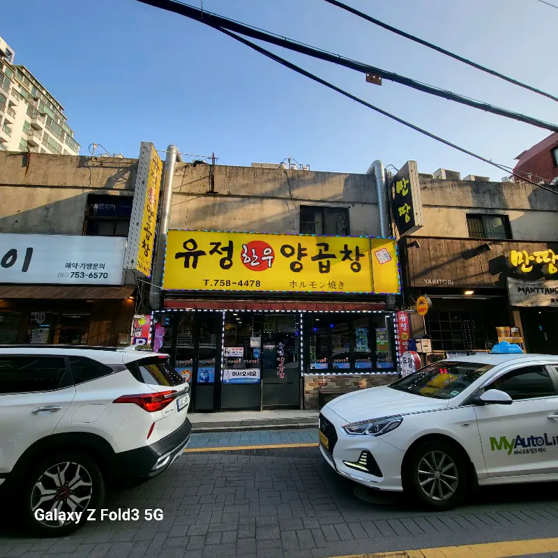 어스름한 저녁, 퇴근 후 발걸음은 자연스레 수영으로 향했다. 오늘따라 유난히 곱창이 당기는 날, 수영에는 곱창 골목이 있다는 정보를 입수하고 벼르던 차였다. 좁다란 골목길을 따라 늘어선 곱창집들 사이에서, 노란 간판에 큼지막하게 쓰인 “유정양곱창”이라는 글자가 눈에 확 들어왔다. 마치 오래된 친구를 만나는 듯한 푸근한 느낌에 이끌려 망설임 없이 문을 열었다.
