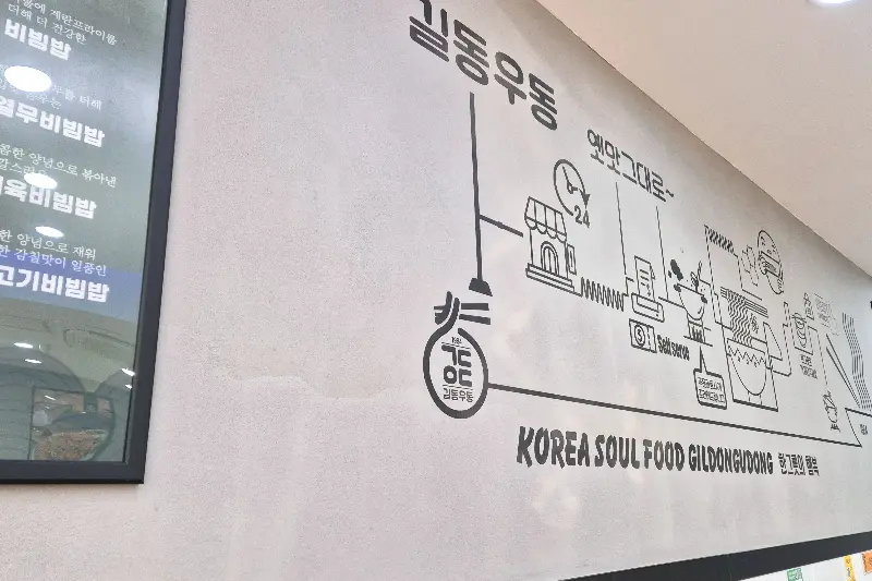 매장 문을 열자, 익숙한 듯 정겨운 풍경이 눈앞에 펼쳐졌습니다. 깔끔하게 정돈된 테이블과 혼자 온 손님들을 위한 혼밥 좌석은 편안한 분위기를 자아냈습니다. 은은하게 퍼지는 따뜻한 우동 국물 냄새는 꽁꽁 얼었던 몸과 마음을 사르르 녹이는 듯했습니다. 벽면에 그려진 익살스러운 그림들은 마치 동네 사랑방 같은 푸근함을 더했습니다.