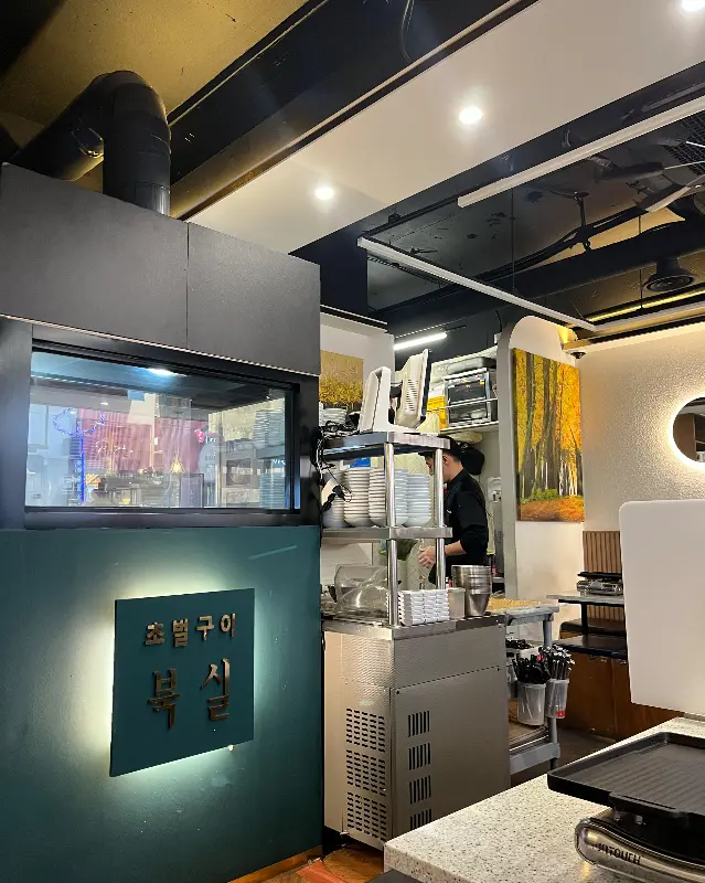 * : 식당 내부의 깔끔하고 모던한 인테리어를 보여준다. 특히 “초벌구이 북실”이라는 간판이 눈에 띈다.