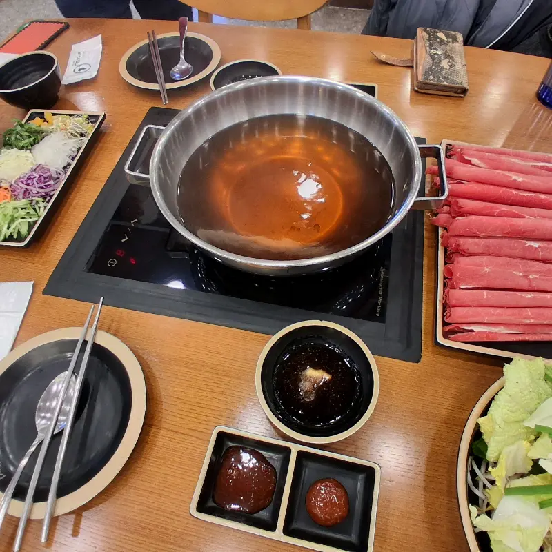 육수가 끓기 시작하자, 기다렸다는 듯이 야채를 듬뿍 넣었다. 배추, 청경채, 숙주, 버섯 등 다양한 야채들이 냄비 안에서 숨을 죽이며 맛있는 향기를 뿜어냈다. 야채가 어느 정도 익자, 얇게 썰린 소고기를 육수에 살짝 담갔다 건져 먹으니, 입안에서 살살 녹는 듯했다. 신선한 야채와 고기의 조화는 정말 환상적이었다.