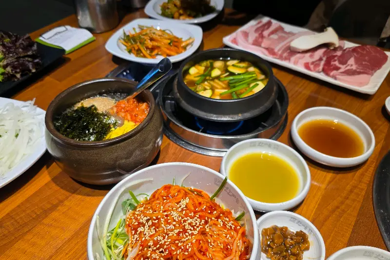 고민 끝에 우리는 숙성 돼지고기 한 마리 세트를 주문했다. 주문을 마치자, 마치 기다렸다는 듯 밑반찬들이 테이블 위를 가득 채우기 시작했다. 샐러드, 김치, 쌈 채소는 기본이고, 잡채, 묵사발, 계란찜, 옥수수 콘까지, 마치 한정식집에 온 듯한 푸짐한 상차림에 입이 떡 벌어졌다. 특히 뜨끈한 된장찌개는 깊고 진한 맛이 일품이었는데, 놀랍게도 리필까지 가능하다고 했다.