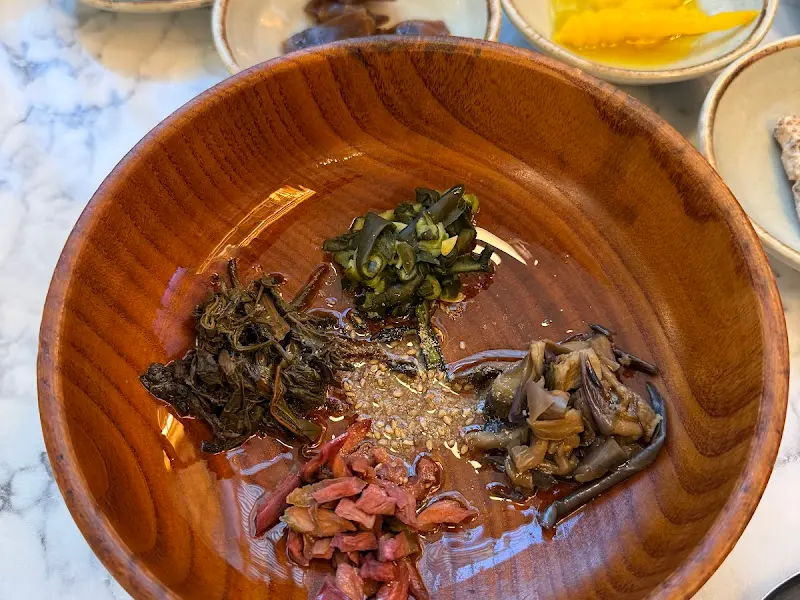 문을 열고 들어서자, 따뜻한 온기와 함께 은은한 약초 향이 코끝을 간지럽혔다. 마치 어머니 품에 안긴 듯 포근하고 정겨운 느낌이었다. 테이블에 앉아 메뉴판을 펼쳐 들었다. 산채비빔밥과 솥밥이 주력 메뉴인 듯했지만, 오늘은 왠지 솥밥에 더 마음이 끌렸다. 솥밥을 주문하려던 찰나, 주말에는 솥밥 주문이 어렵다는 이야기에 아쉬움을 삼키며 산채비빔밥으로 메뉴를 바꿨다.