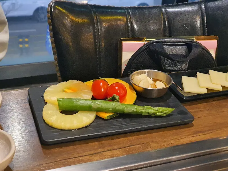 소고기 본연의 맛을 음미한 후, 이번에는 함께 제공된 가니쉬와 곁들여 먹어보기로 했다. 잘 구워진 아스파라거스와 토마토는 소고기의 느끼함을 잡아주었고, 달콤한 파인애플은 입안을 상큼하게 마무리해주었다. 특히 구워 먹는 치즈는 쫄깃한 식감과 고소한 맛이 더해져, 소고기와 환상의 궁합을 자랑했다. 이 조합, 정말 칭찬하지 않을 수 없다. 쉴 새 없이 젓가락을 움직이며 소고기를 즐기는 동안, 어느새 테이블 위는 텅 비어 있었다.