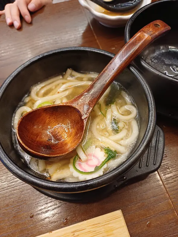 따뜻한 국물이 생각날 때쯤, 뚝배기 우동이 나왔다. 김이 모락모락 나는 뚝배기 안에는 쫄깃한 면발과 쑥갓, 어묵, 유부 등 푸짐한 재료가 가득 들어 있었다. 나무로 만든 큼지막한 숟가락으로 국물을 한 입 떠먹으니 온몸이 따뜻해지는 기분이었다. 멸치 육수를 베이스로 한 국물은 깔끔하면서도 깊은 맛을 냈다. 탱글탱글한 면발은 씹는 재미를 더했고, 쑥갓의 향긋함은 입안을 개운하게 해주었다.