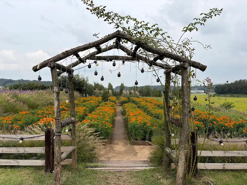꽃밭으로 향하는 아치형 나무문. 그 너머로 펼쳐진 꽃들의 향연은 마치 꿈결 같았다.