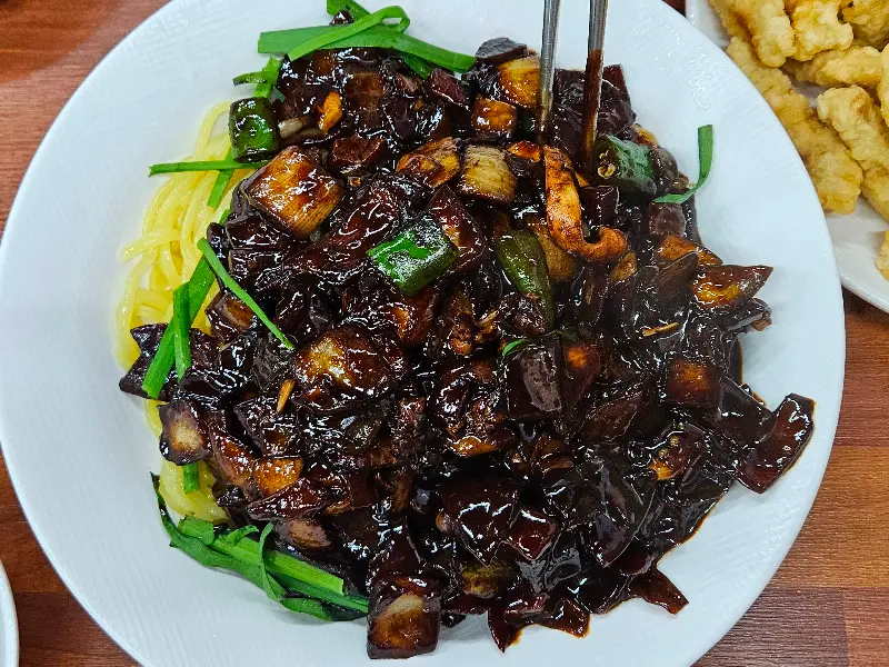 주문 후, 따뜻한 자스민 차가 먼저 나왔다. 은은한 향이 입안을 맴돌아 식사 전 입맛을 돋우기에 충분했다. 테이블 한쪽에는 간장, 식초, 고춧가루가 가지런히 놓여 있었고, 곧이어 기본 반찬인 단무지, 양파, 춘장이 나왔다. 흑색의 긴 사각 접시에 담겨 나온 모습이 정갈했다. 특히 얇게 슬라이스 된 양파는 신선함이 느껴졌다. 아삭아삭 씹히는 식감과 특유의 매콤함이 춘장과 어우러져 묘한 조화를 이뤘다.