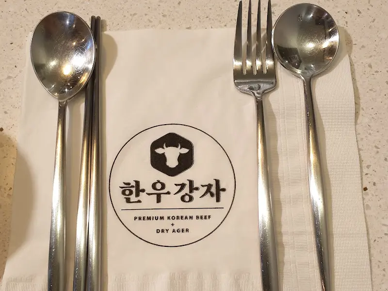 자리에 앉자, 정갈하게 놓인 테이블 세팅이 눈에 들어왔다. 냅킨 위에 놓인 수저와 포크, 그리고 젓가락은 고급스러움을 더했고, 냅킨 중앙에 새겨진 ‘한우강자’ 로고는 이 곳이 한우에 대한 자부심이 남다른 곳임을 은연중에 드러내는 듯했다.