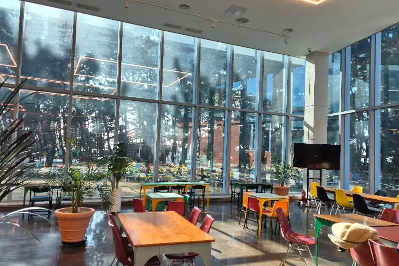 카페 문을 열자, 따스한 온기가 온몸을 감쌌다. 바깥의 차가운 겨울바람은 잊은 채, 나는 홀린 듯 안으로 걸어 들어갔다. 드넓은 공간은 높은 층고 덕분에 시원하게 느껴졌고, 통창 너머로는 푸르른 소나무 숲이 그림처럼 펼쳐졌다. 마치 숲 속에 들어와 있는 듯한 착각을 불러일으키는 풍경이었다. 통창으로는 바람개비가 돌아가는 모습도 보였다.