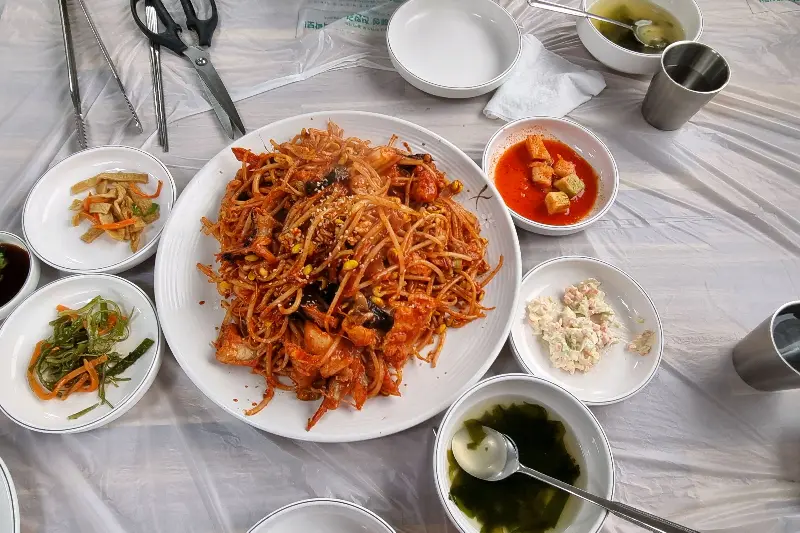 해물찜과 다양한 밑반찬이 차려진 테이블 전경