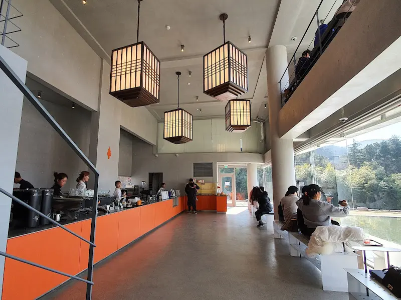 카페에 도착하자 가장 먼저 눈에 들어온 것은 넓은 주차장이었다. 주차 공간은 마치 잘 정돈된 퍼즐처럼 질서정연하게 배치되어 있었고, 그 뒤로는 웅장한 건물이 위풍당당하게 서 있었다. 건물 외벽에는 카페의 상징인 듯한 주황색의 나무 그림이 심플하면서도 세련된 느낌을 자아냈다. 참고) 마치 산속의 오아시스 같은 공간이 눈앞에 펼쳐진 것이다.