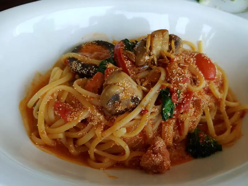 스테이크와 함께 주문한 관자와 새우가 들어간 오일 파스타 또한 훌륭했습니다. 면은 적당히 쫄깃했고, 오일 소스는 느끼하지 않고 담백했습니다. 특히, 신선한 관자와 새우는 입 안에서 톡톡 터지는 식감이 일품이었으며, 파스타의 풍미를 한층 더 끌어올려 주었습니다. 파스타 위에 뿌려진 파르미지아노 레지아노 치즈는 짭짤하면서도 고소한 맛을 더해, 파스타의 풍미를 더욱 풍성하게 만들어주었습니다.