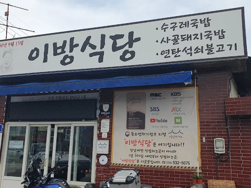 창녕 이방시장은 과거 대구 구지, 고령, 합천 등과 인접해 있어 거래가 활발한 장소였다고 한다. 지금은 인적이 드문 창녕 전통 5일장이 되었지만, 여전히 그 명맥을 이어가고 있다. 이방식당은 바로 이 이방면 소재지 장터에 위치한 수구레국밥 원조집이다. 백년가게로 선정되었을 뿐 아니라, 여러 방송에도 소개될 정도로 유명한 곳이다.