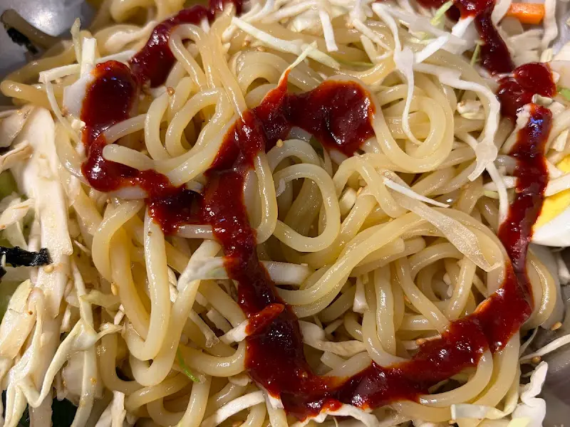드디어 기다리고 기다리던 쫄면이 나왔다. 스테인리스 그릇에 담겨 나온 쫄면은, 보기만 해도 입안에 침이 고이는 비주얼이었다. 굵은 면발 위에 빨간 양념장, 채 썬 양배추와 당근, 오이, 김 가루, 깨소금이 듬뿍 뿌려져 있었다. 삶은 계란 반쪽이 앙증맞게 자리 잡고 있는 모습도 인상적이었다. 사진 속 쫄면의 면발은 일반적인 쫄면보다 훨씬 굵어 보였다. 마치 우동 면발처럼 굵직한 면발이 쫄깃한 식감을 자랑할 것 같았다.