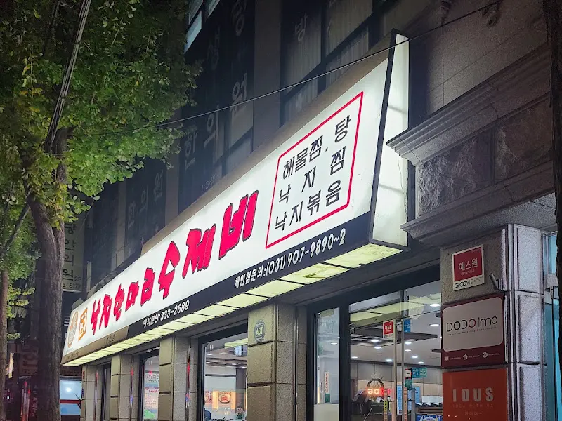 가게 앞에 다다르니, 빗소리와 함께 맛있는 냄새가 코를 찔렀다. 커다란 간판에는 빨간 글씨로 “팔미낙지수제비”라고 쓰여 있었다. 서둘러 문을 열고 안으로 들어섰다. 테이블은 이미 사람들로 북적거렸지만, 다행히 한 자리가 남아있었다.