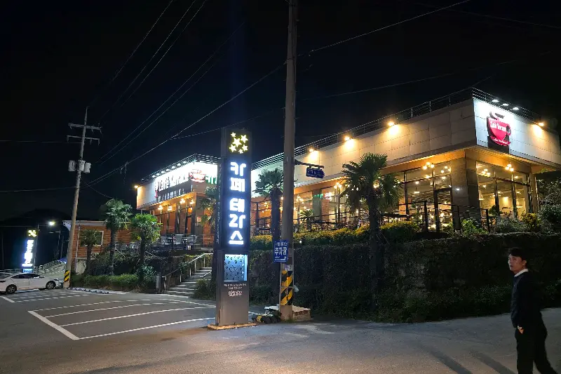 카페 앞에 도착하자, 넓은 주차장이 가장 먼저 눈에 들어왔다. 주차 공간이 넉넉해서, 복잡한 시간대에도 주차 걱정 없이 편안하게 방문할 수 있겠다는 생각이 들었다. 외관은 꽤나 웅장했다. 2층 건물 전체가 카페였는데, 통유리창 너머로 보이는 내부 모습이 무척이나 따뜻하고 아늑해 보였다.