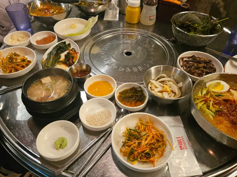 자리를 잡고 앉자, 직원분께서 친절하게 메뉴를 안내해주셨다. 우리는 고민 끝에 ‘모둠 한판’을 선택했다. 돼지고기의 다양한 부위를 맛볼 수 있다는 점이 매력적이었고, 무엇보다 고기를 직접 구워주신다는 점이 마음에 들었다. 사실, 고기 굽는 스킬에 따라 맛이 천차만별로 달라지기 때문에, 전문가의 손길은 언제나 옳다고 생각한다. 주문을 마치자, 순식간에 테이블 위로 밑반찬들이 차려졌다.