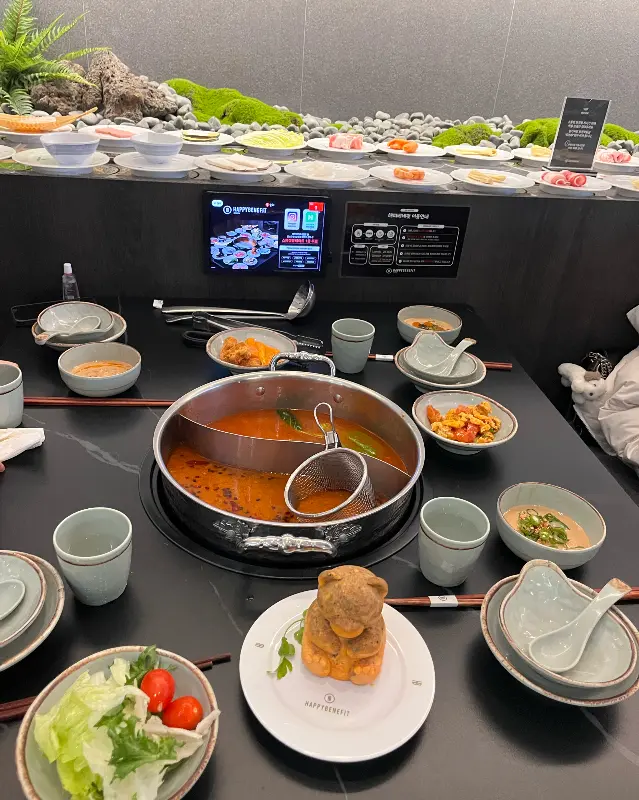 며칠 전부터 훠궈가 어찌나 당기던지, 퇴근하자마자 곧장 성수로 향했다. 오늘 나의 발길을 멈추게 한 곳은 바로 ‘해피베네핏 성수점’. 곰돌이 모양 육수로 유명한 이곳은, 평소 깔끔한 인테리어와 신선한 재료 덕분에 훠궈 마니아들 사이에서 입소문이 자자한 곳이다. 매장 문을 열자마자 눈에 들어온 건, 마치 고급 레스토랑을 연상시키는 세련된 인테리어였다. 은은한 조명 아래, 테이블 위를 가득 채운 훠궈 냄비와 그 주변을 쉴 새 없이 회전하는 레일의 모습은 그야말로 장관이었다.
