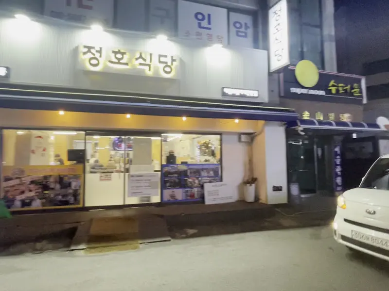 안양 일번가 근처는 역시나 복잡했다. 네비게이션이 안내하는 대로 따라갔지만, 주차는 쉽지 않았다. 주변을 몇 바퀴나 돌았을까, 드디어 가까운 주차 공간을 찾아 차를 세울 수 있었다. 새롭게 이전했다는 정호식당은 환한 불빛을 내뿜으며, 깔끔한 외관을 자랑하고 있었다. 유리창 너머로 보이는 북적이는 풍경은 이미 맛집임을 증명하는 듯했다.