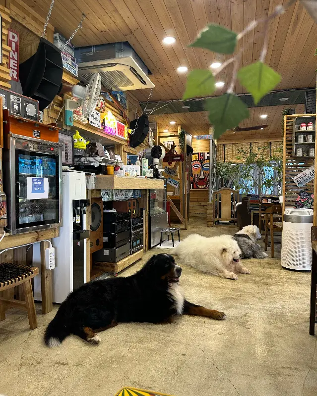 카페에 들어서자마자 가장 먼저 눈에 띄는 것은 역시 세 마리의 덩치 큰 강아지들, 미자, 나대, 건달이었다. 녀석들은 마치 오랜 친구를 맞이하듯 꼬리를 흔들며 격하게 반겨주었는데, 그 모습이 어찌나 사랑스럽던지 절로 미소가 지어졌다. 특히 늠름한 풍채의 건달이는 묵직하게 엎드려 손님들을 맞이하는 모습이 마치 카페의 터줏대감 같았다. 사진 속에서 보던 것보다 훨씬 크고 순한 모습에 아이들은 물론 어른들까지 모두 녀석들에게 푹 빠져드는 듯했다.
