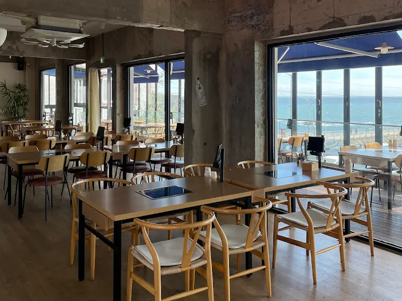 문을 열자, 시원한 에어컨 바람과 함께 눈앞에 펼쳐진 것은 기대 이상의 풍경이었다. 넓고 쾌적한 공간, 통유리창 너머로 펼쳐지는 푸른 바다가 가슴을 탁 트이게 했다. 마치 카페에 온 듯 세련된 인테리어와 곳곳에 놓인 싱그러운 식물들은 편안한 분위기를 더했다. 창가 자리에 앉으니, 파도가 부서지는 모습과 하늘을 가득 채운 구름이 한 폭의 그림처럼 다가왔다.