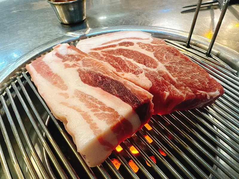 드디어 기다리고 기다리던 흑돼지 목살과 오겹살이 등장했다. 선홍빛 살코기와 눈처럼 하얀 지방이 층층이 겹쳐진 모습이 마치 예술 작품처럼 아름다웠다. 고기 표면에는 칼집이 섬세하게 들어가 있어, 육즙이 빠져나가지 않고 속까지 고루 익도록 배려한 세심함이 느껴졌다. 두툼한 흑돼지 근고기를 보니, 왜 이곳이 서귀포 흑돼지 맛집으로 유명한지 단번에 알 수 있었다.