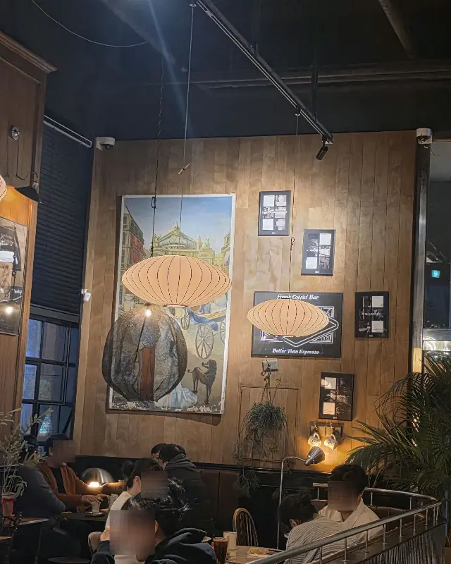 카페에 들어서자마자, 눈앞에 펼쳐진 풍경은 기대 이상이었다. 따뜻한 조명이 아늑하게 감싸는 공간은, 차분한 우드톤 인테리어와 어우러져 편안하면서도 세련된 분위기를 자아냈다. 마치 유럽의 작은 바에 들어선 듯한 느낌이랄까. 웅장한 스피커에서는 감미로운 음악이 흘러나와 공간을 더욱 풍성하게 채웠다.