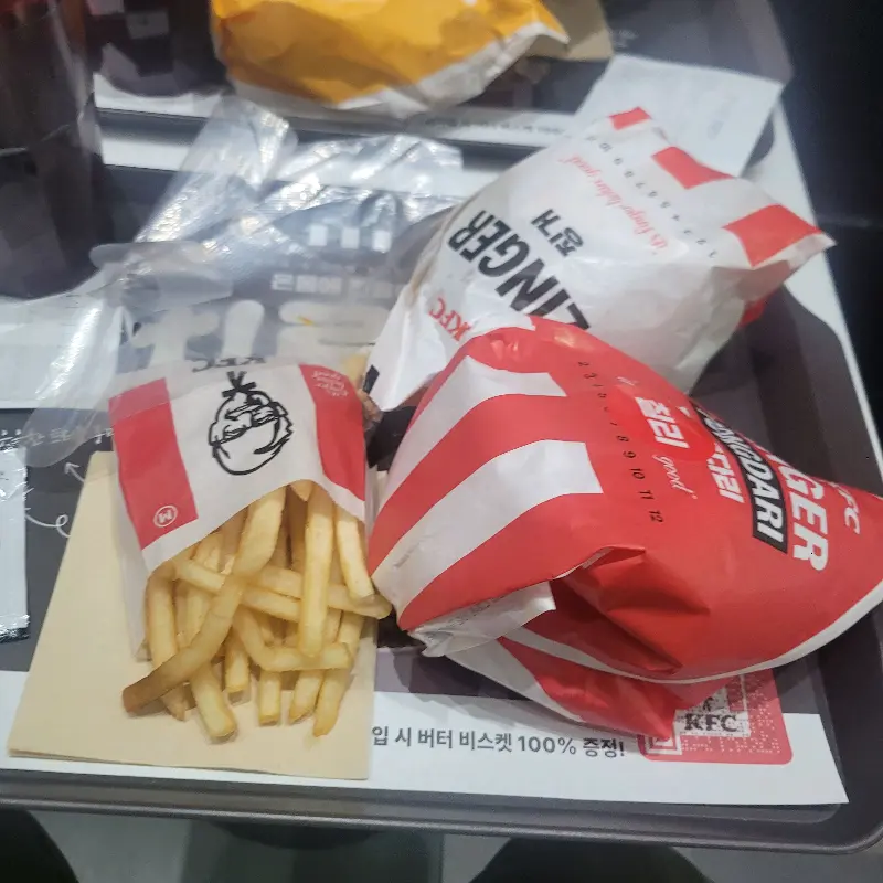 따뜻한 치킨너겟을 한 입 베어 무니, 부드러운 닭고기의 풍미가 입안 가득 퍼졌다. 겉은 바삭하고 속은 촉촉한 치킨너겟은 언제 먹어도 맛있다.에서 보이는 KFC 포장지에 담겨있는 모습은 언제나 설렌다. 통다리는 짭짤하면서도 매콤한 맛이 일품이었다. 아침부터 든든하게 배를 채우니, 하루를 활기차게 시작할 수 있을 것 같았다.