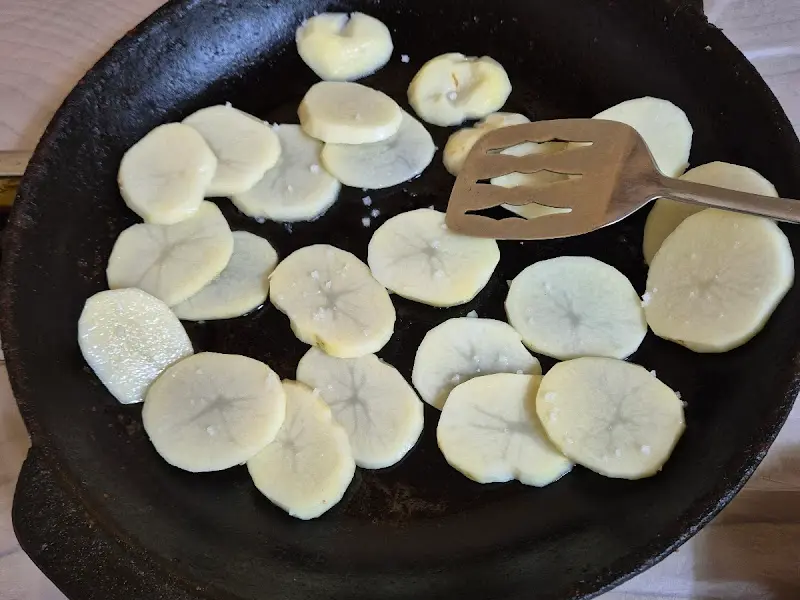 파전을 순식간에 해치우고 나니, 감자구이가 나왔다. 뜨겁게 달궈진 팬 위에 노릇하게 구워진 감자들은 보기만 해도 군침이 돌았다. 젓가락으로 감자 한 조각을 집어 입에 넣으니, 겉은 바삭하고 속은 포슬포슬한 식감이 일품이었다. 특히, 은은하게 느껴지는 단맛은 감자의 풍미를 더욱 깊게 만들어주는 듯했다. 사진을 보면 알겠지만, 얇게 썰린 감자가 뜨거운 철판 위에서 지글거리는 소리, 그 찰나의 순간이 미각을 자극한다. 겉은 살짝 노릇하게 구워지고, 속은 촉촉함을 유지하는 것이 이 감자구이의 핵심 비법일 것이다.