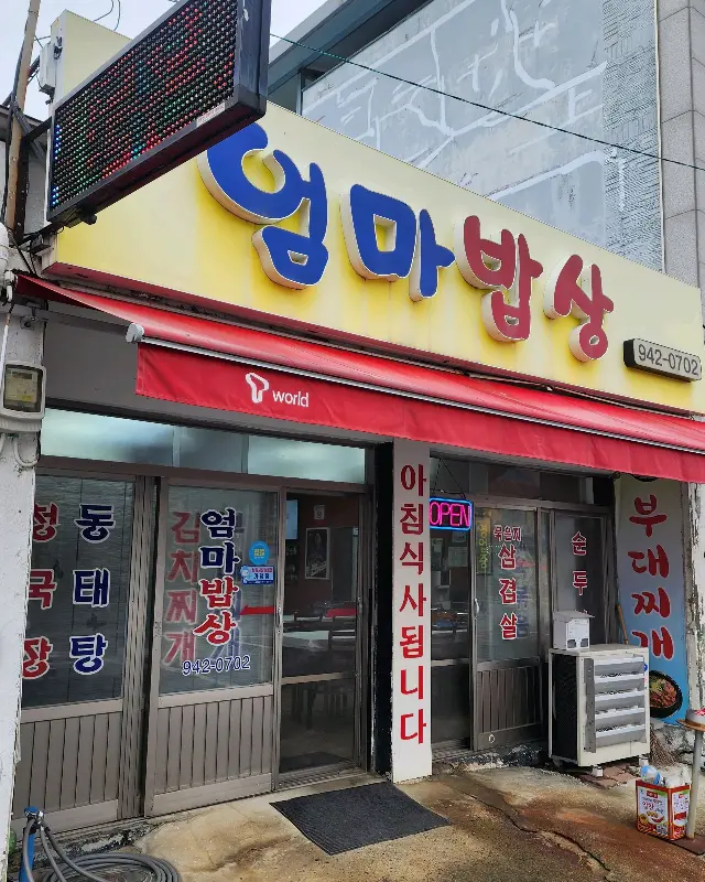네비게이션에 주소를 찍고 설레는 마음으로 출발했다. 드디어 도착한 ‘엄마밥상’은 겉모습부터 소박하고 정겨운 느낌이 물씬 풍겼다. 커다란 간판에 큼지막하게 쓰인 “엄마밥상”이라는 글자가 마치 고향집에 온 듯한 편안함을 안겨주었다. 빨간색 어닝과 그 아래 가지런히 놓인 화분들이 더욱 친근하게 느껴졌다. 유리창에는 ‘아침 식사 됩니다’라는 문구가 붙어 있었는데, 이른 아침부터 따뜻한 밥을 먹을 수 있다는 점이 무척 마음에 들었다.