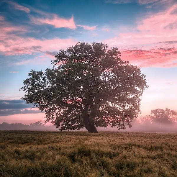 푸른 하늘 아래 펼쳐진 드넓은 초원과 그 위에 홀로 우뚝 서 있는 나무의 모습