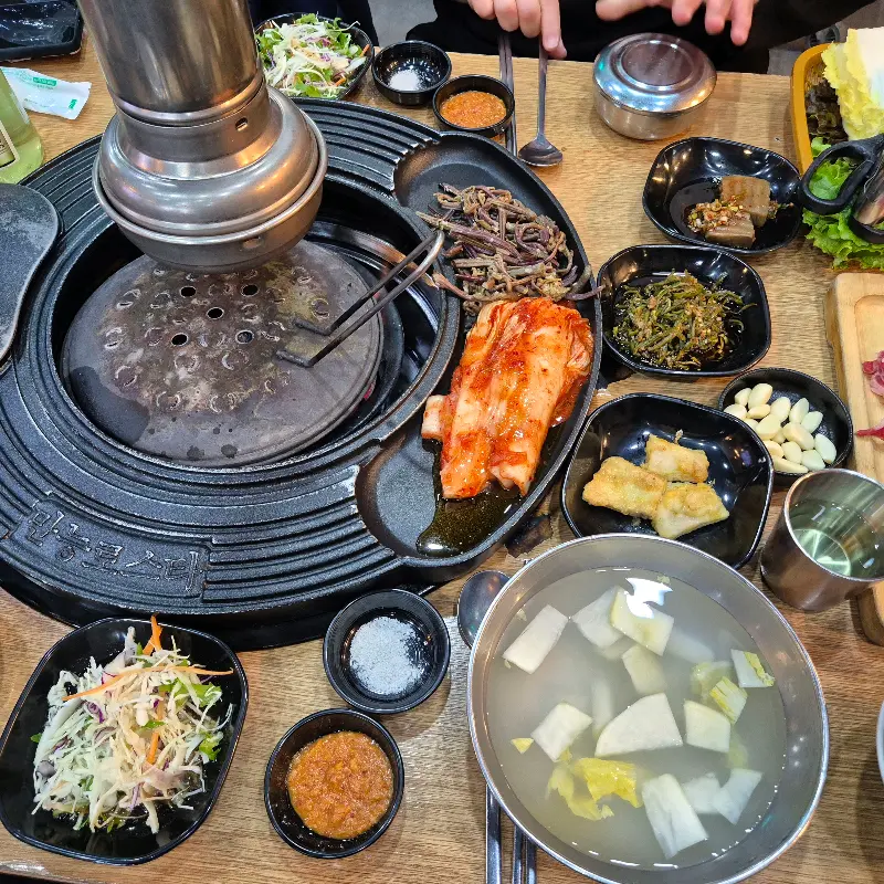 우리는 소갈비살 한 판과 된장찌개를 주문했다. 태블릿으로 주문을 마치자, 순식간에 밑반찬들이 테이블을 가득 채웠다. 김치, 고사리, 샐러드 등 하나하나 정갈하게 담겨 나온 반찬들은 보기만 해도 군침이 돌았다. 특히 김치와 고사리는 어머니의 손맛이 느껴지는 깊은 맛이었다.