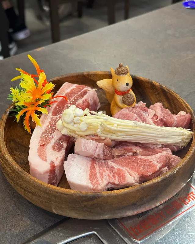 잠시 후, 드디어 기다리고 기다리던 삼겹살이 등장했습니다. 나무 도마 위에 얹어져 나온 삼겹살은, 그 비주얼부터가 남달랐습니다. 선명한 붉은 빛깔과 촘촘하게 박힌 마블링은, 누가 봐도 신선하고 좋은 품질의 고기라는 것을 알 수 있었습니다. 마치 예술 작품을 보는 듯한 아름다운 모습에, 감탄사가 절로 나왔습니다. 곁들여 나온 싱싱한 새송이버섯과 앙증맞은 장식들은 시각적인 즐거움을 더했습니다.
