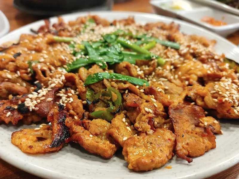 윤기가 자르르 흐르는 석쇠 불고기 위로, 싱싱한 채소가 듬뿍 올려져 나왔다.