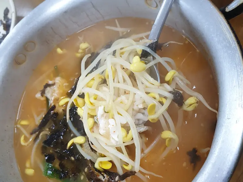 주문 후 얼마 지나지 않아, 김이 모락모락 나는 콩나물 국밥이 눈앞에 놓였다. 뚝배기 안에는 콩나물과 밥, 김가루, 그리고 잘게 썰린 고추가 듬뿍 들어 있었다. 국물은 맑고 깔끔해 보였다. 무엇보다 인상적이었던 것은 콩나물의 양이었다. 마치 인심 좋은 할머니가 끓여주는 듯, 뚝배기 가득 담겨 있었다.